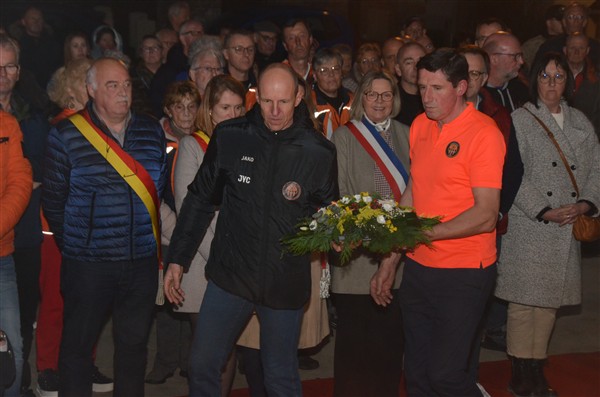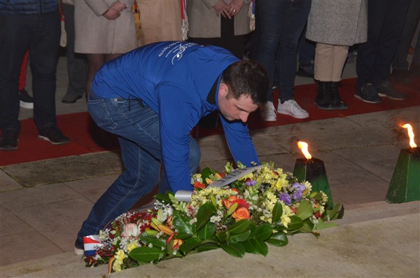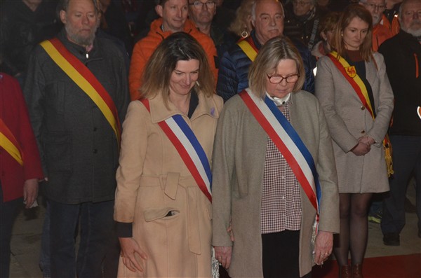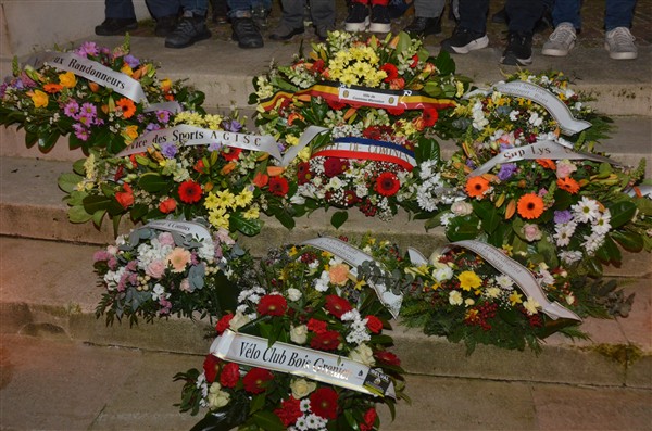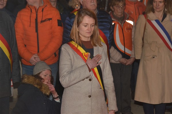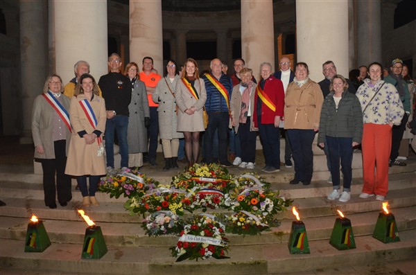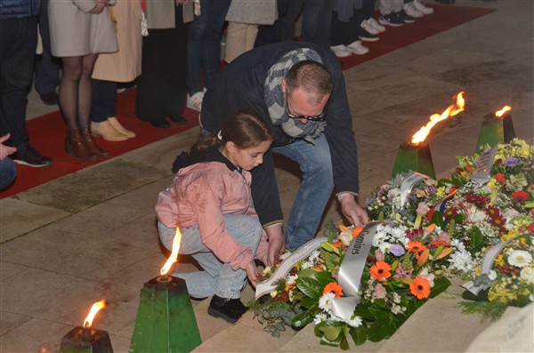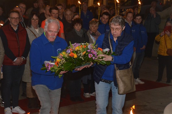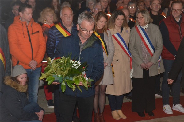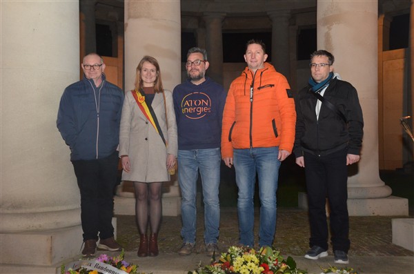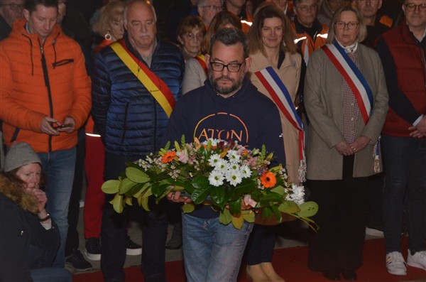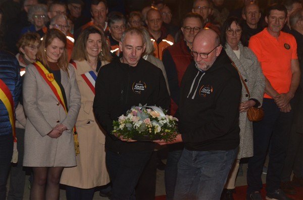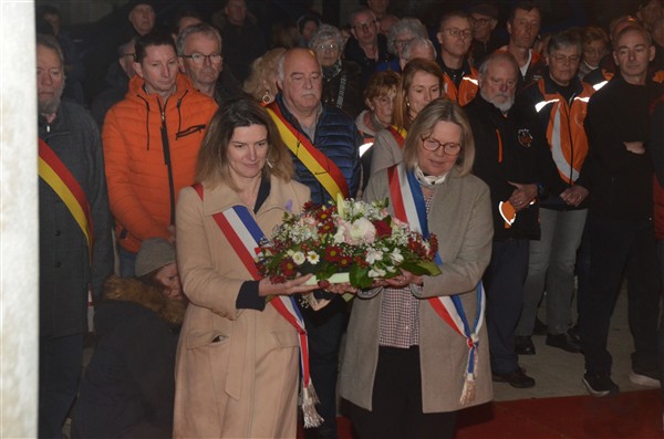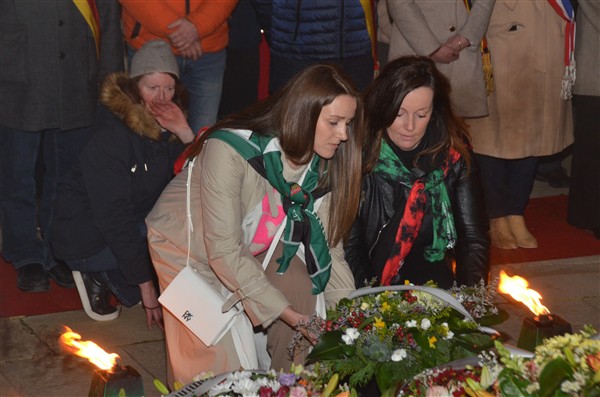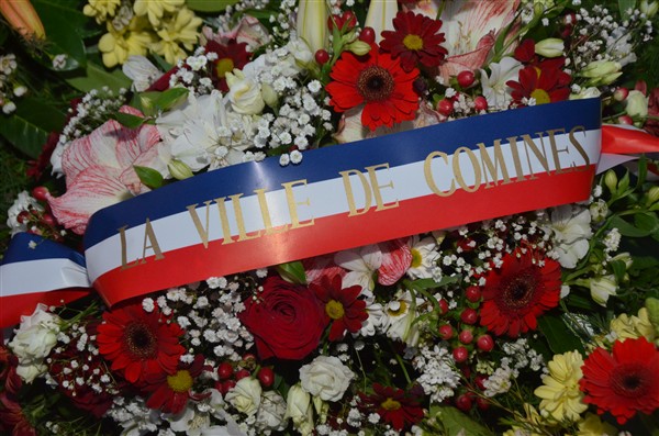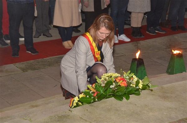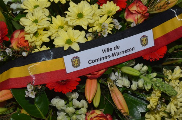 Neerleggen van de kransen, met als eerste burgemeester Alice Leeuwerck van Komen-Waasten.