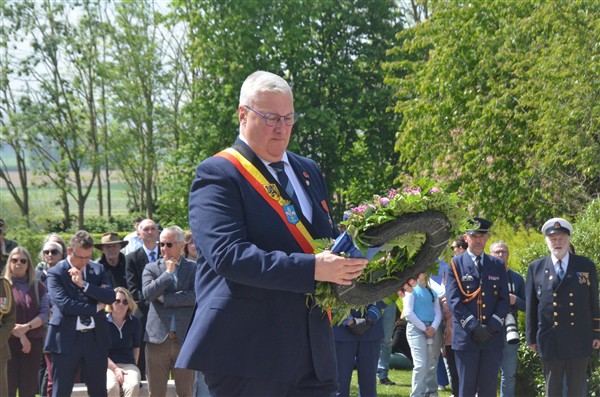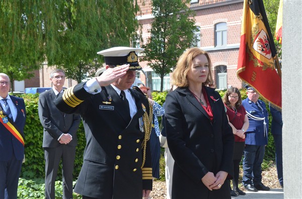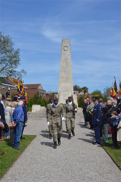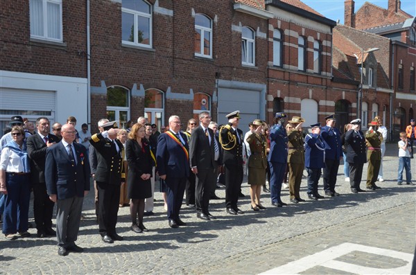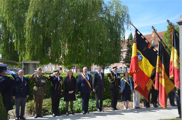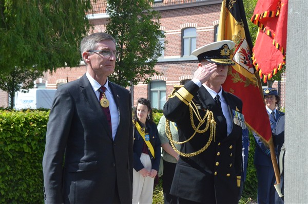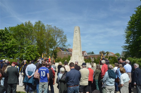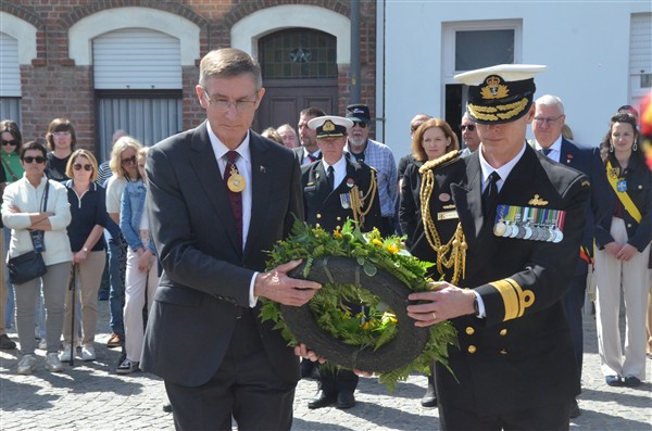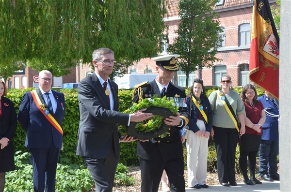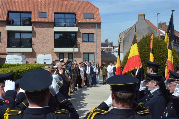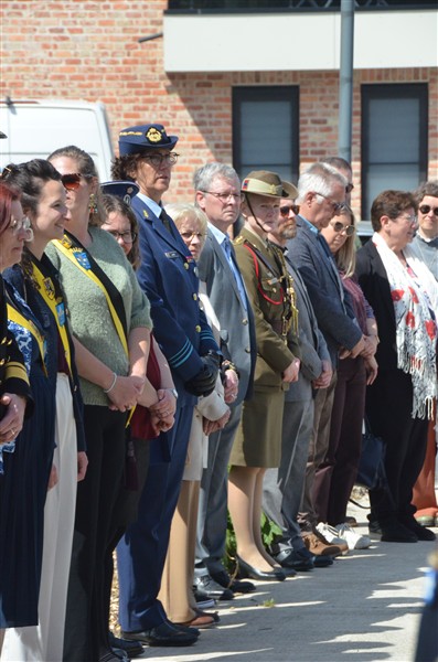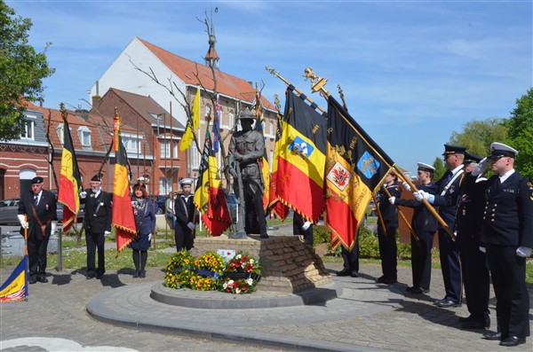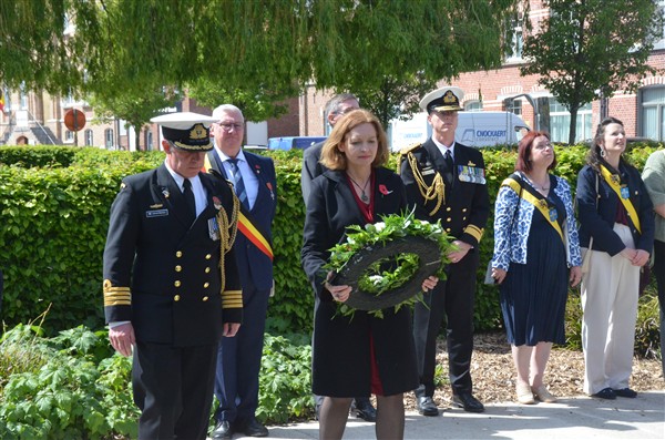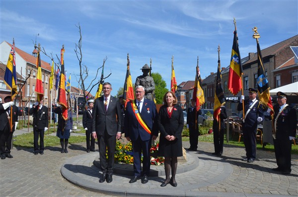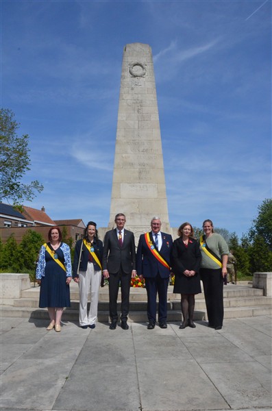 Daarna ging het richting de markt van Mesen waar bloemen werden neergelegd aan het gemeentelijk gedenkteken voor de oorlogsslachtoffers.
