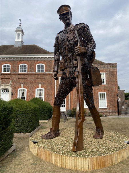 Het beeld kijkt uit naar de namen van duizenden gesneuvelden op de Menenpoort – kameraden die, net als hij, zijn lot deelden. Initiatiefneemster Jo Oliver vertelde hoe ze als kind de aanwezigheid voelde van een jonge soldaat die nooit thuiskwam. Zijn geestelijke nalatenschap inspireerde haar tot de creatie van The Hauntings: een figuur die iedereen uitdaagt en inspireert om na te denken over oorlog, verlies en menselijkheid. Het volledige verhaal lees je in de bijlage.