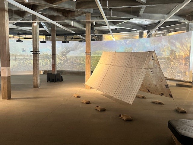 If I Write Again van Selva Aparicio. De kunstenares maakte If I Write Again als artist in residence in het In Flanders Fields Museum in Ieper en liet zich hiervoor inspireren door de persoonlijke brieven en militaire tenten uit de museumcollectie. Aparicio toont 1.000 scans van brieven in een reeks onderling verbonden tentzeilen.