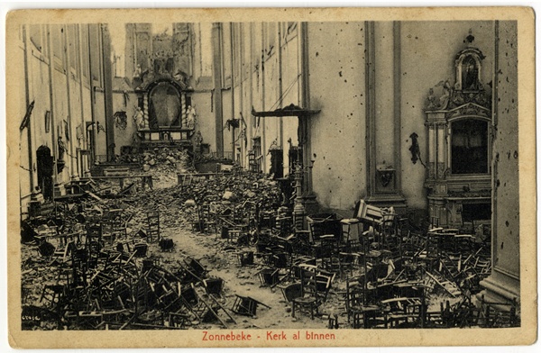 Een zicht op de vernielde kerk in juli 1915, met aan de rechterkant het 18de-eeuwse zijaltaar, de vermoedelijke locatie van het Engelenhoofdje (Collectie Zonnebeekse Heemvrienden)